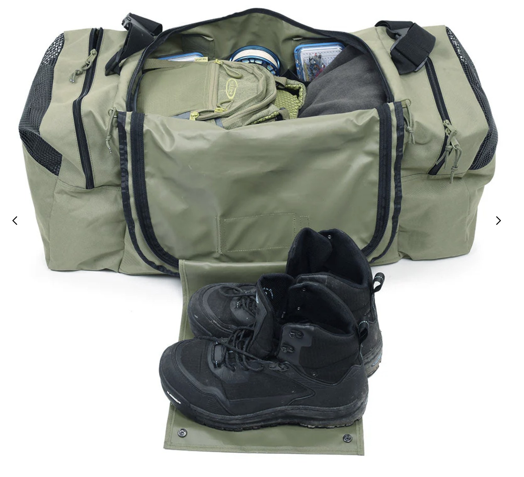 I due scomparti laterali drenanti, dotati di fori e inserti in rete, sono perfetti per trasportare waders e scarponi bagnati, favorendo l’asciugatura senza compromettere l’interno della borsa. Una tasca laterale aggiuntiva e una tasca superiore coperta completano la dotazione, offrendo ulteriore spazio per cartellini identificativi o oggetti extra.