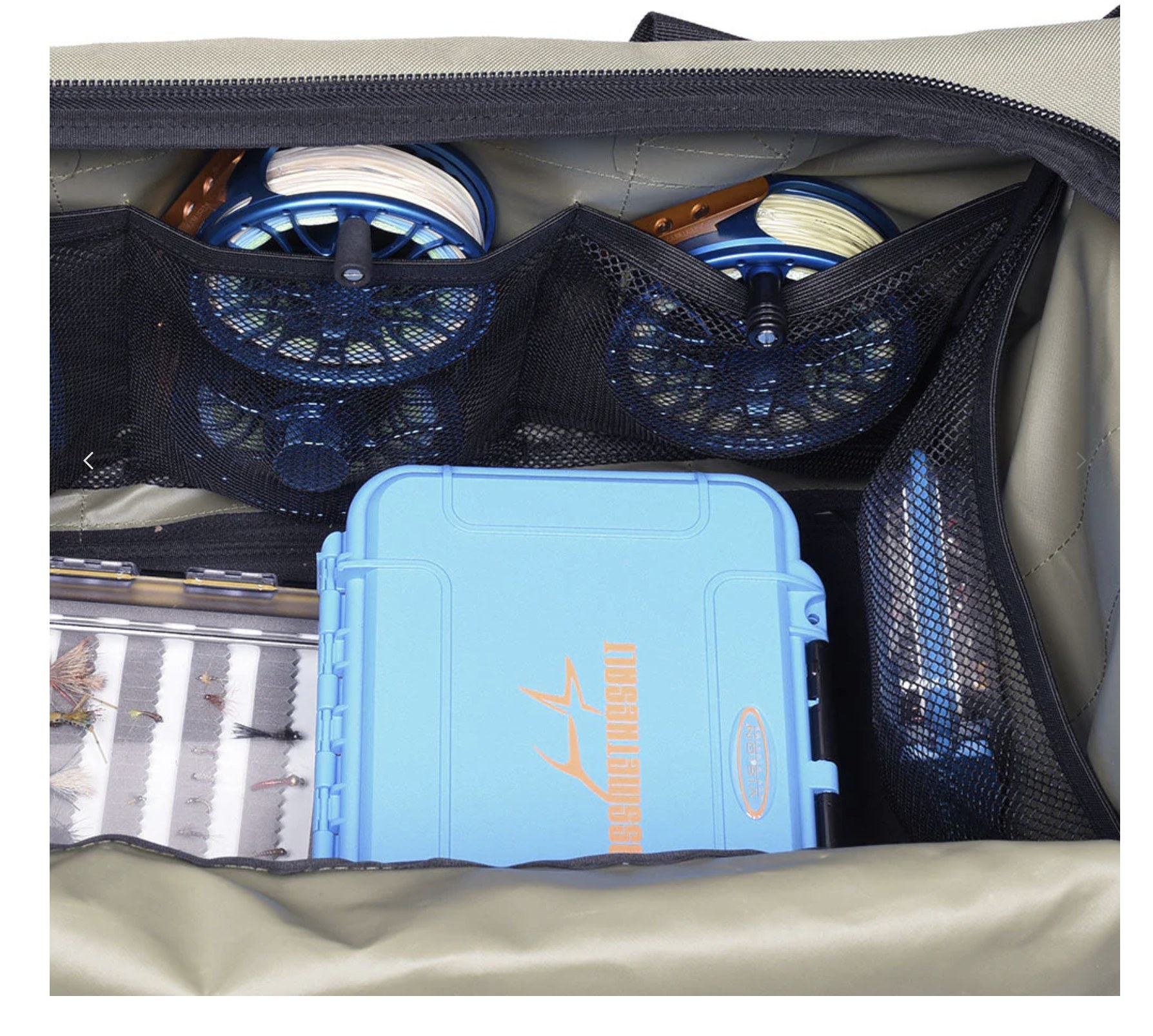 Il grande scomparto centrale con apertura a U consente uno stoccaggio rapido e ordinato, mantenendo tutto asciutto e facilmente accessibile. All’interno, pratiche tasche in rete con elastici di ritenzione permettono di organizzare piccoli accessori da pesca, terminali, bobine e minuterie in modo intelligente.
