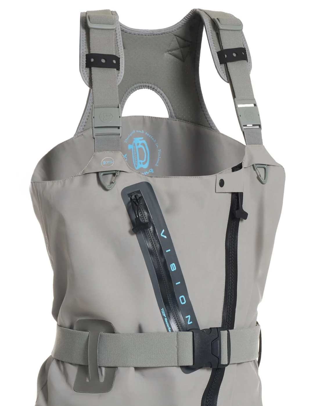 La cerniera frontale TiZip MasterSeal 10, montata in posizione angolata, migliora la distribuzione del carico sulle bretelle e semplifica tutte le operazioni: ingresso/uscita, ventilazione e gestione delle pause durante la pesca. A fianco della cerniera principale è presente una tasca impermeabile con TiZip MasterSeal 6, dotata internamente di clip a D e una tasca supplementare con velcro per accessori critici.